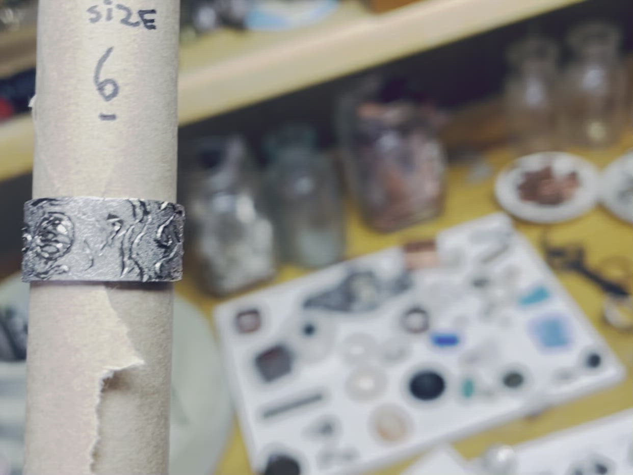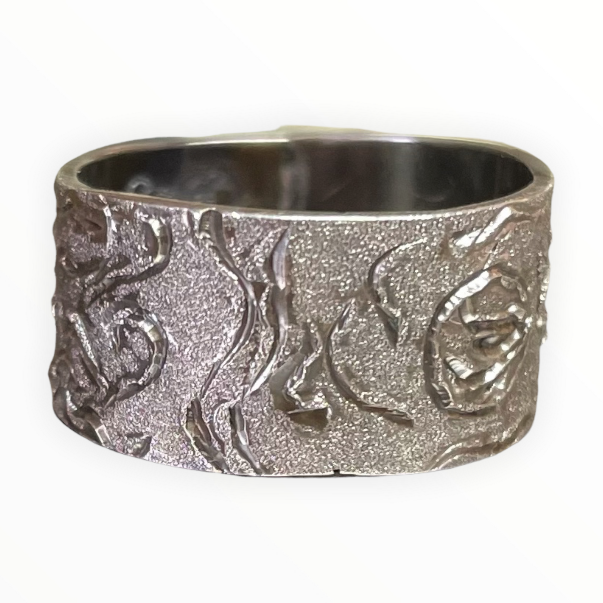 A wide band ring of sterling silver embellished with the ancient technique of free-form chasing. This ring is a part of the Intuition Collection.